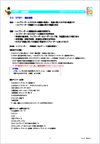 「ECEQ®コーディネーターマニュアル」は、コーディネーター用に各STEPの準備物や手順等の解説を記載しています。「実施園マニュアル」は、実施園の準備物や各STEPの流れ等を記載しておりますので、ECEQ®コーディネーターが印刷して実施園に渡すか、「ECEQ®資料館」のページから実施園にダウンロードしてもらうよう伝えてください。また進行表やワークシート等も必要に応じて適宜活用ください。