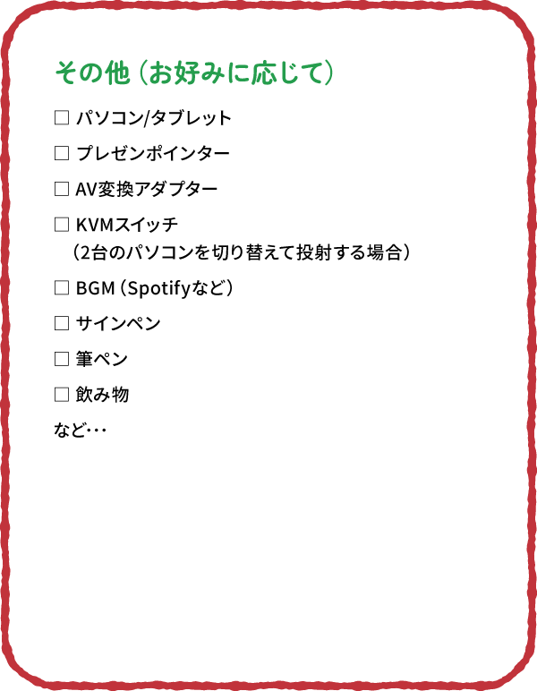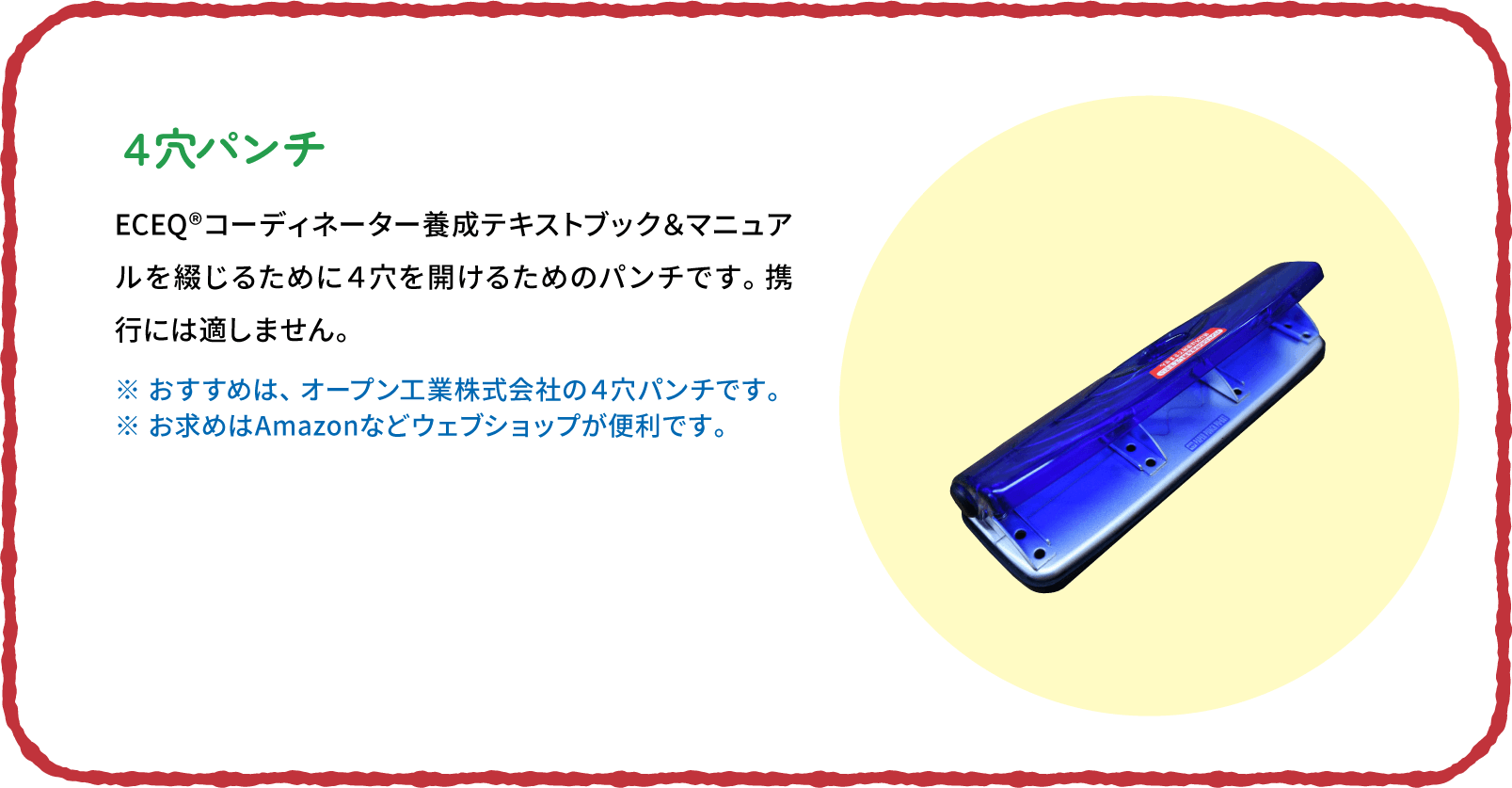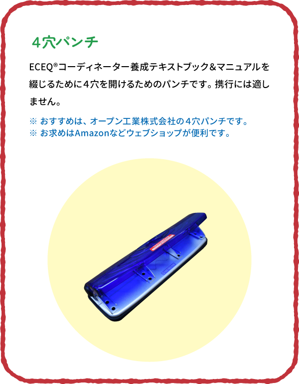 ECEQ®コーディネーターとして活動する際に持っておくと便利な道具たちをご紹介します。いずれも実践を経て使いやすさなどに定評があるプロフェッショナル仕様です。 あなたもぜひ使いこなして、実施園にとって「いてくれてよかった!」ECEQ®コーディネーターとして活躍してください。