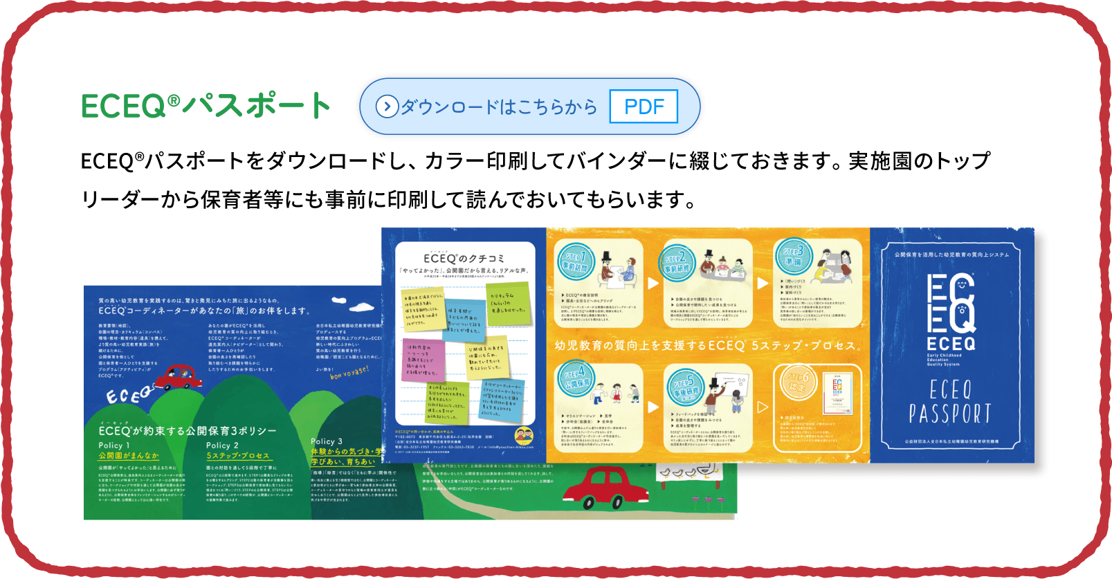このページでは、ECEQ®実施の手順等を整理した 「ECEQ®コーディネーターマニュアル」と「実施園マニュアル」、 その他の書類を格納しています。必要に応じてダウンロードしてご利用ください。